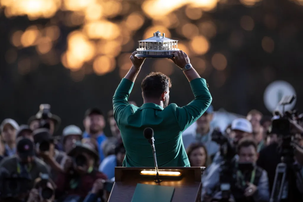 グリーンジャケットセレモニーでマスターズトロフィーを掲げるジョン・ラーム