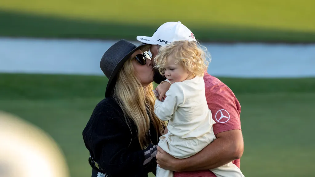 18番ホールで祝福に駆けつけた妻のケリーと息子のケパ